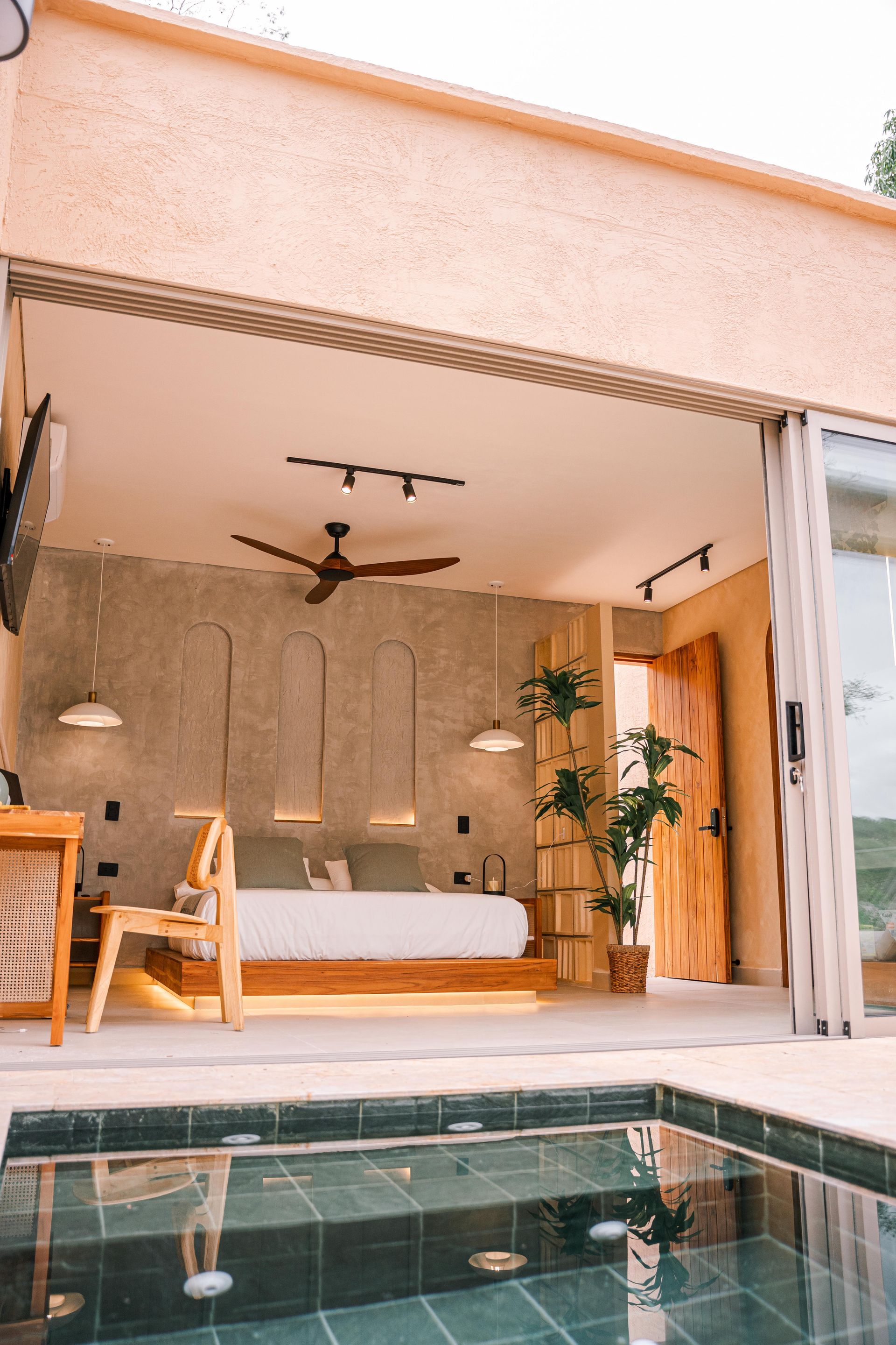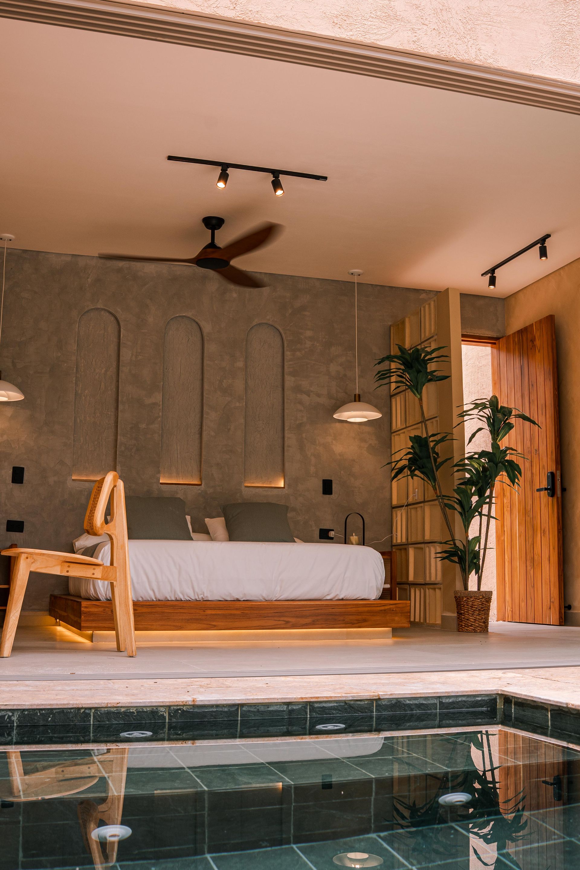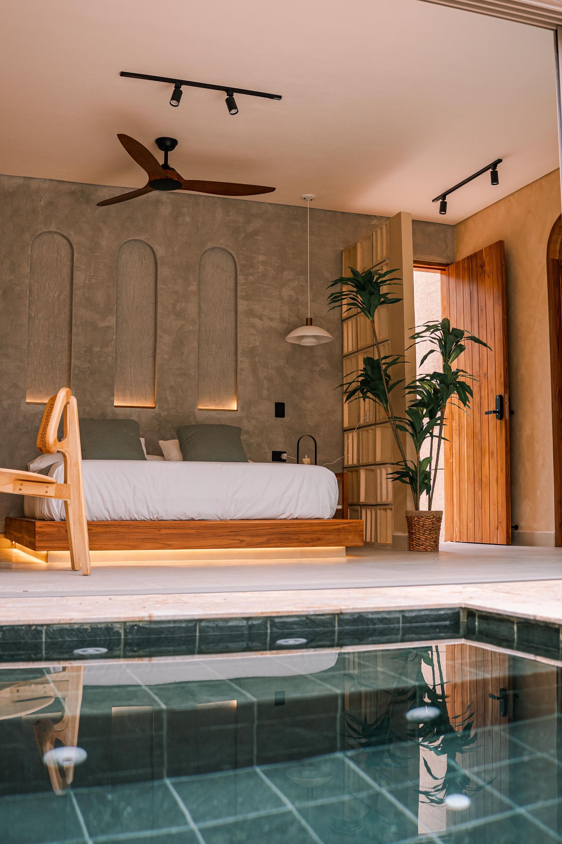 Con un diseño que combina líneas limpias y tonos cálidos, esta habitación ofrece una atmósfera relajante con materiales naturales como madera, piedra y tejidos ligeros que te harán sentir experiencias nunca antes exploradas.