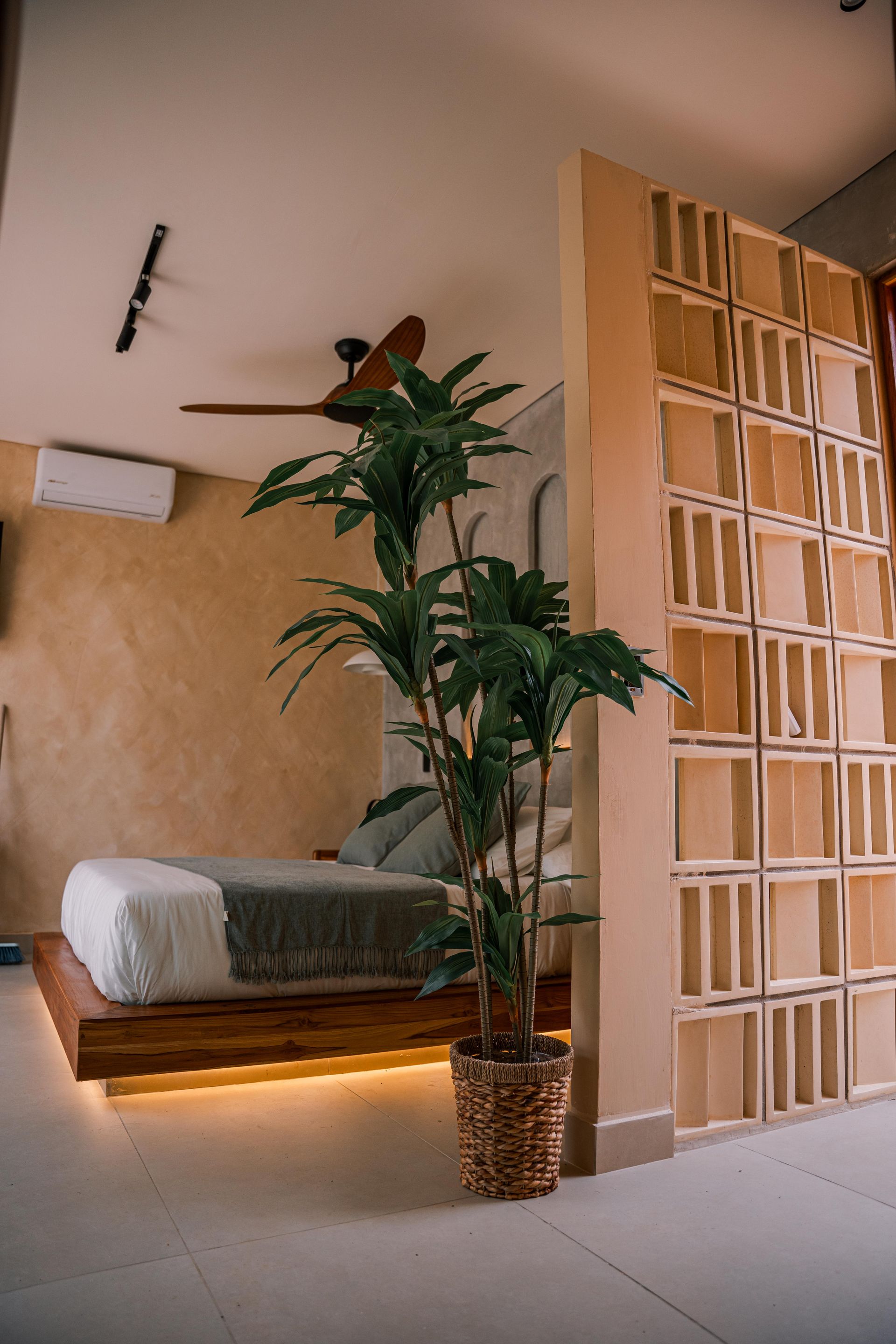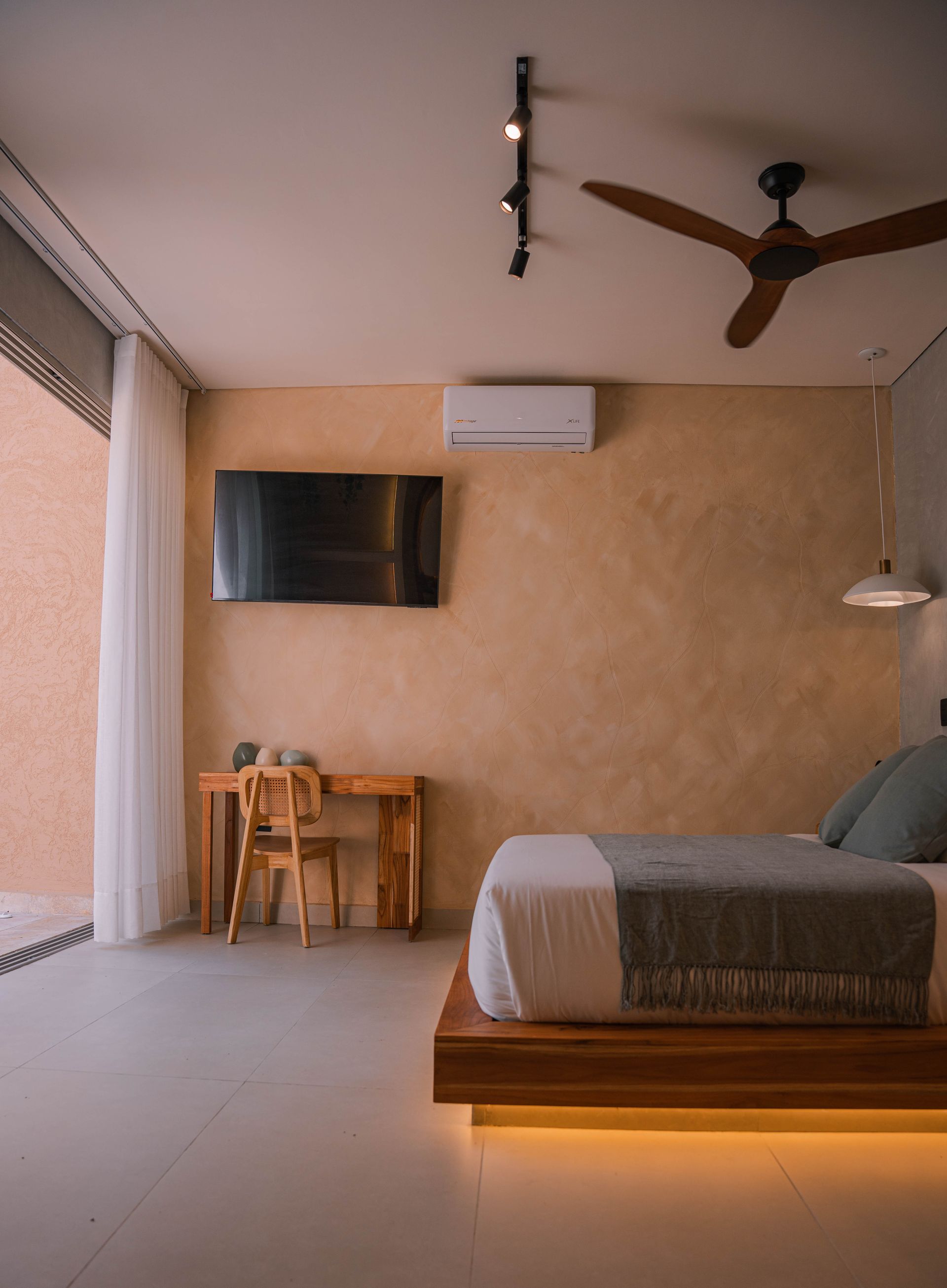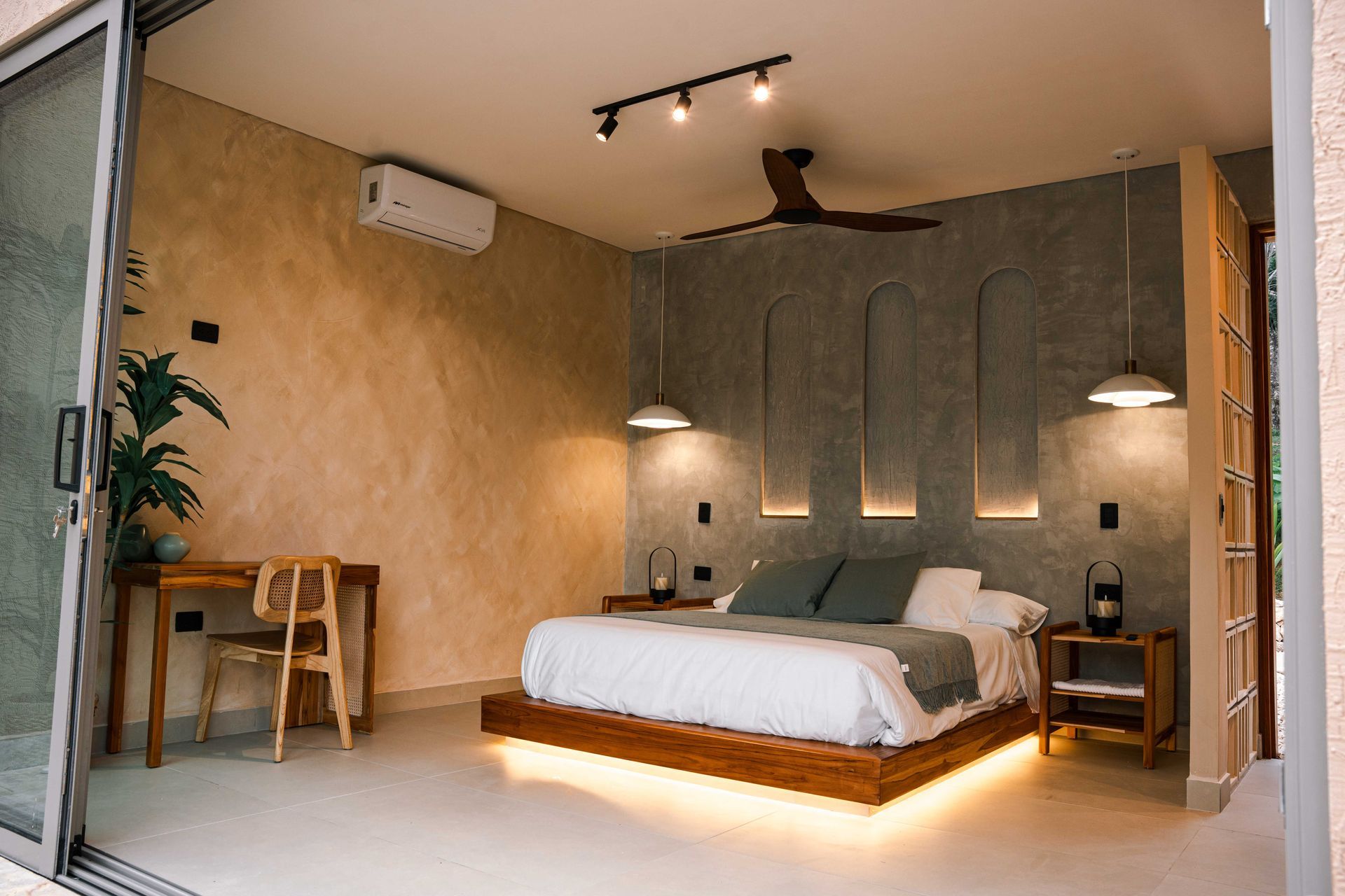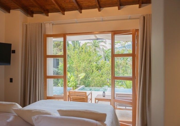 Con un diseño que combina líneas limpias y tonos cálidos, esta habitación ofrece una atmósfera relajante con materiales naturales como madera, piedra y tejidos ligeros que te harán sentir experiencias nunca antes exploradas.