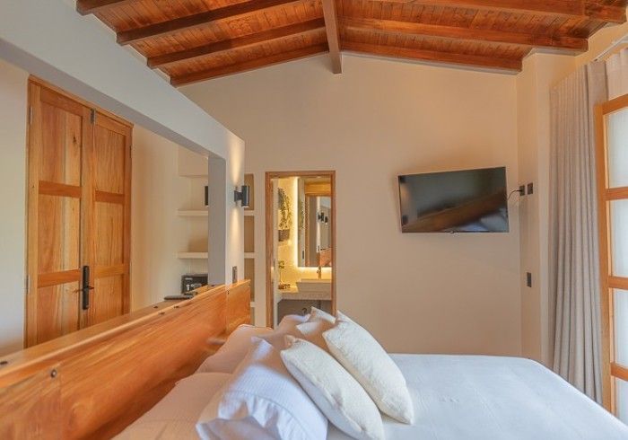 La Suite Villa Camila es un refugio de lujo inspirado en el hogar de la viajera Camila, donde cada rincón cuenta una historia de sus aventuras. Con una decoración cálida y detalles artesanales, esta suite transporta a los huéspedes a un espacio de ensueño. Su gran atractivo es un jacuzzi privado, perfecto para relajarse tras un día explorando. La luz tenue y los aromas naturales crean una atmósfera de serenidad. Los muebles, seleccionados con esmero, evocan el carácter antioqueño de Camila.